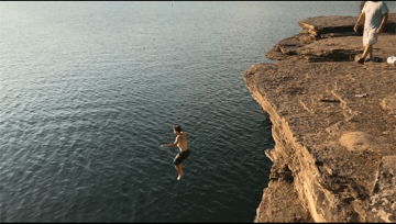 I came to this cliff. I looked over the edge. I saw the water below–seemed like a hundred feet–and I almost pissed myself. No, sorry, I did not almost piss myself–that was an incorrect remembrance. The tingle in my trunks was nothing but an adrenaline high, I swear.